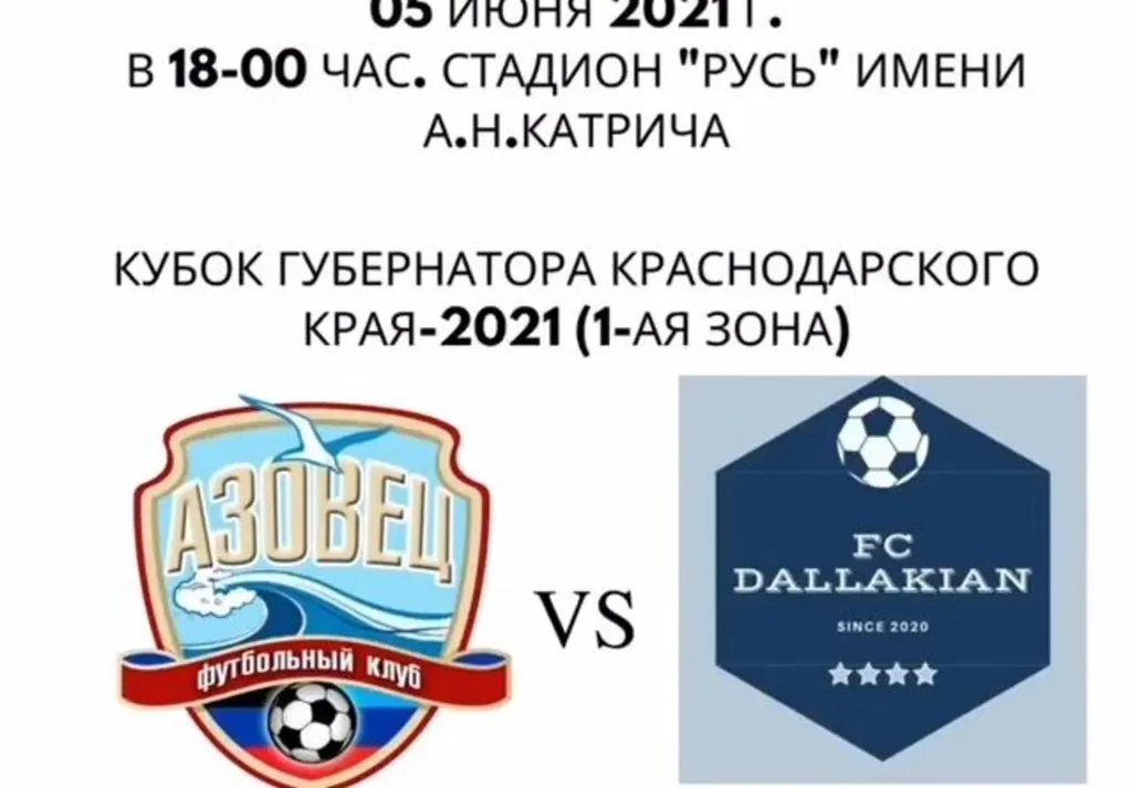 05 июня 2021г, в 18-00 час., на стадионе Русь пройдёт встреча футбольных команд ФК Азовец и ФК Даллакян, в рамках Кубка губернатора Краснодарского края — 2021г. Первая группа, 6 тур.